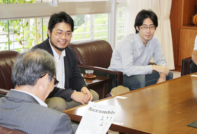 市長と話をする天野さん(手前)と佐藤さん