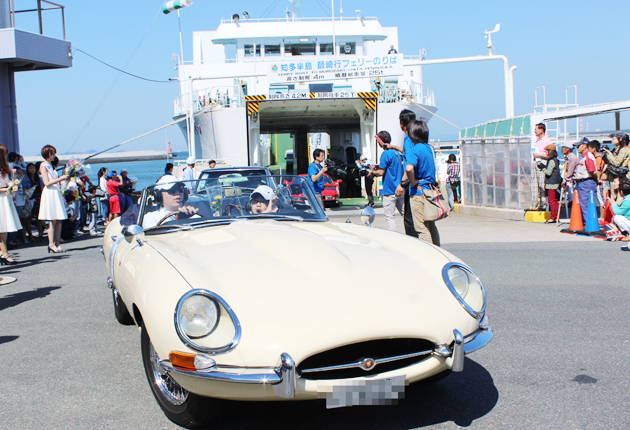 師崎港からの船から降りるクラシックカー