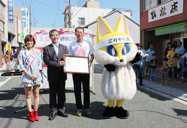 稲葉市長から感謝状を受け取った榊原寛二ごりやく市実行委員長(左から3人目)
