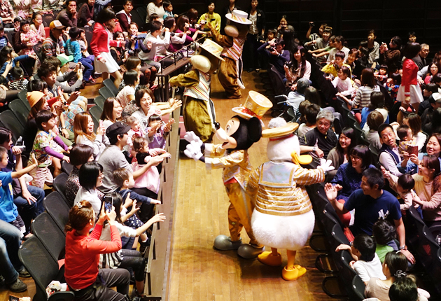 観客に愛嬌(あいきょう)を振りまくディズニーのキャラクターたち