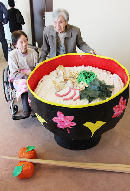 蒲郡市のデイサービスセンター竹島園の利用者らは、同市のご当地グルメ「ガマゴリうどん」の特大模型を完成させ、6日、蒲郡商工会議所に寄贈した。9日に同市である「全国ご当地うどんサミット」の会場で一般に披露される。 高さ81センチ、直径97セン...