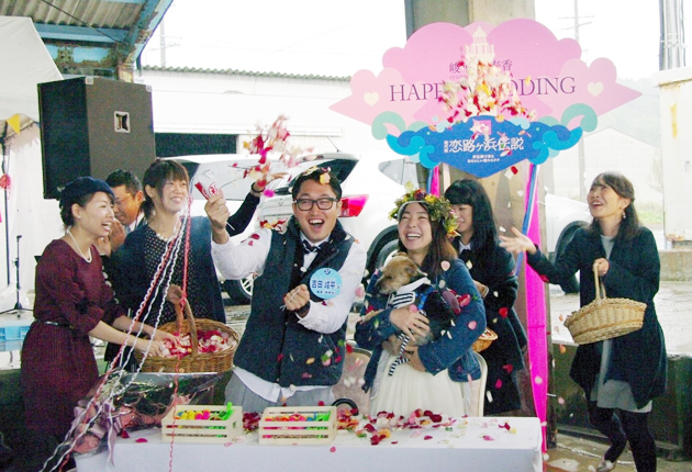 クローバーや花のシャワーを浴びる柴田さん夫妻
