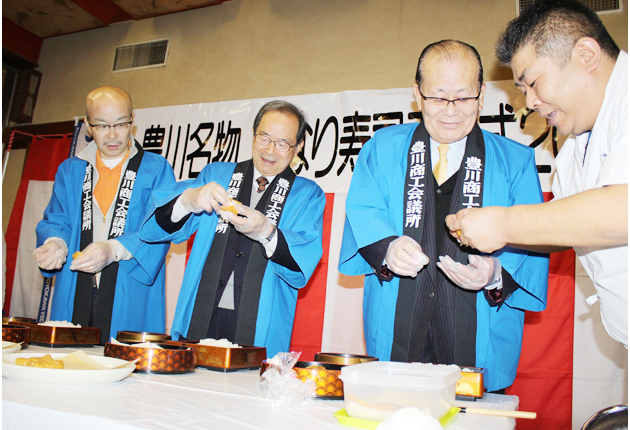 豊川市の豊川稲荷で開かれている秋季大祭で、豊川商工会議所青年部(夏目泰至会長)は22日、同所で「豊川名物いなり寿司奉納式2014」を開き、県内の青年部メンバーなど約50人が出席。商売繁盛や家業繁栄、所願満足などを祈願した。 式では、山脇実...