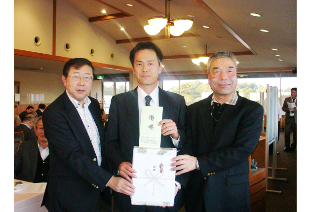 優勝した今井文章さん㊥に優勝賞品を渡すニューライフフジ田中社長㊨とニューライフ会棚橋会長