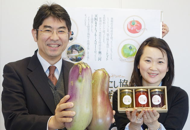 ジャムのギフトセットを掲げる竹本あゆみさん㊨と、天狗なすを持つ豊根村役場の青山幸一・地域振興課長