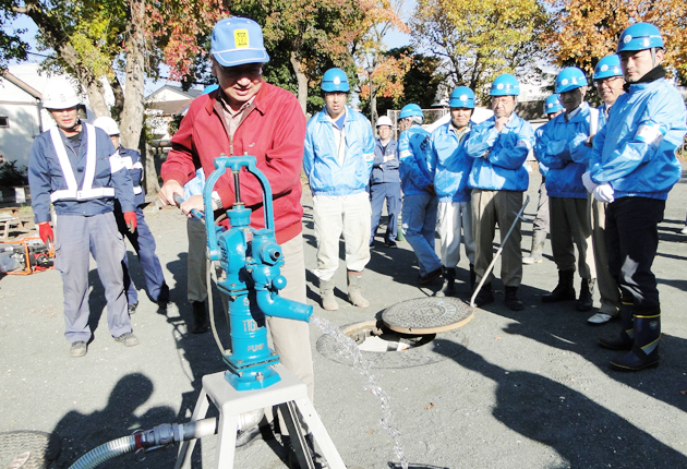 耐震性貯水槽から水をくみ上げる参加者
