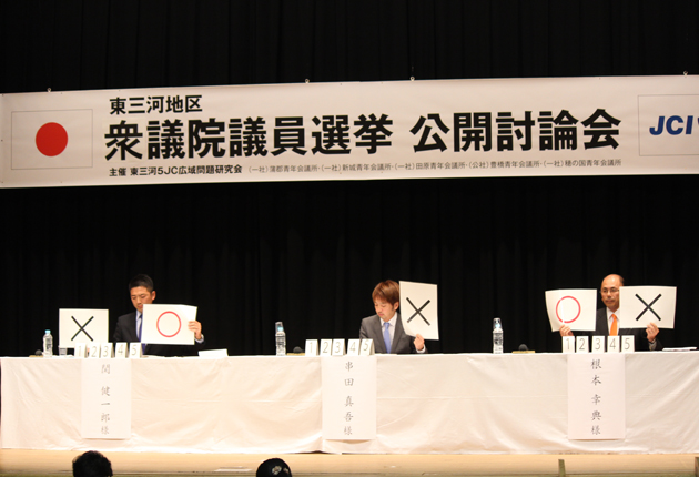 3人がそれぞれの意見を主張した公開討論会(豊橋市公会堂で)