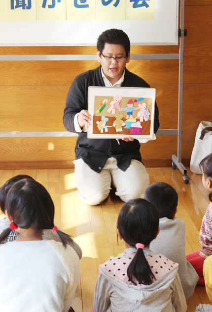 折り紙紙芝居で子どもらを楽しませる横井さん