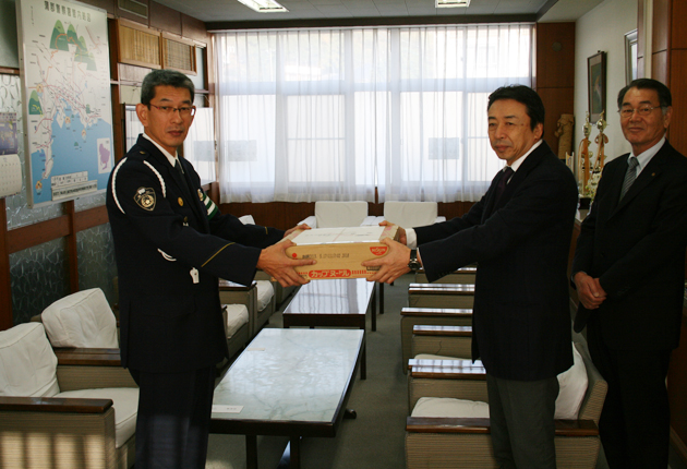 小嶋署長㊧に慰問品のカップ麺を手渡す小池会頭