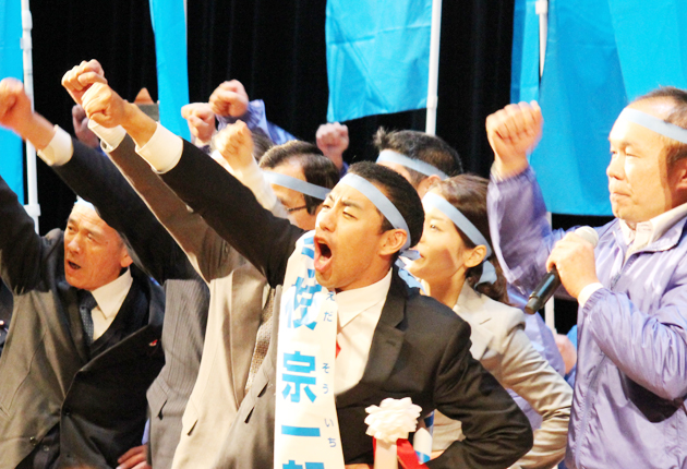 ガンバローと拳を振り上げる今枝候補(中央)ら