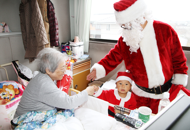 豊橋の中村さんサンタに扮する/豊生病院でプレゼント手渡し