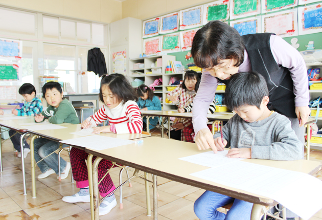 ひらがなを書く練習をする園児ら