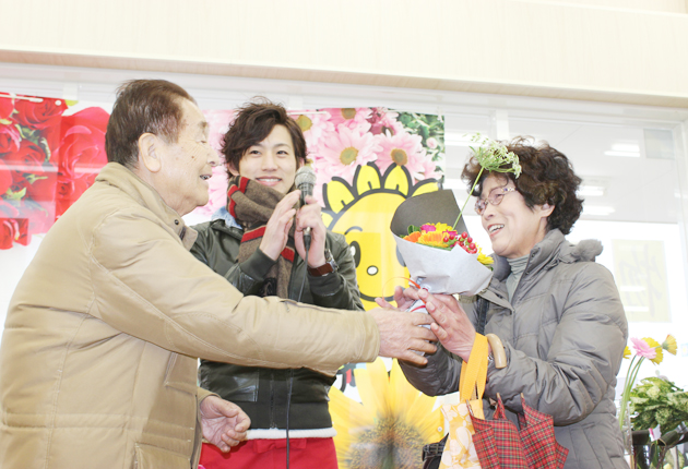 妻の美智子さんに花束を渡す山本充雄さん㊧