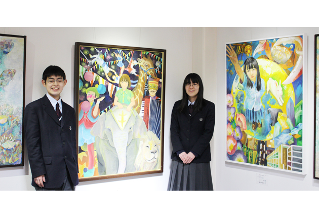 「学外の多くの人に見てもらえてうれしい」と話す、美術部員の澤田琴子さん㊨と都築航君