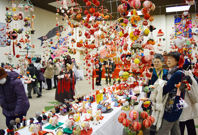 華やかで艶やかなひな人形やつるし飾りが並んだ
