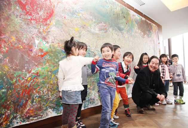 児童ら50人 大型キャンバスに表現/画家・松井守男さんが豊橋でワークショップ