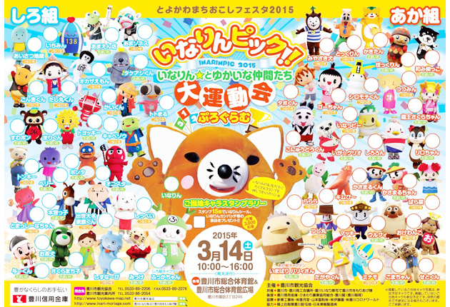 3月14日に豊川市総合体育館と同館広場で開かれる「とよかわまちおこしフェスタ2015・いなりんピック」のプログラムが完成し、主催する同市観光協会が概要を発表した。 今年は全国から60のゆるキャラが参加し、イベントを盛り上げる。 メーンイベ...