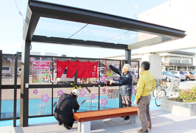 田原市福江町のショッピングセンターレイ前のバス停にこのほど、雨よけや木製ベンチを備え、まちの情報発信機能もある待合所が完成した。福江・清田まちづくり推進協議会のメンバーらは、停留所につるし飾りやのれん、菜の花を飾りつけ、バス利用者などに現...