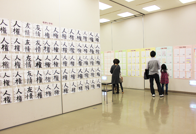 人権をテーマにした書道作品などが並ぶ会場(蒲郡市博物館で)