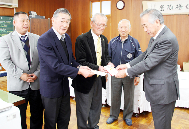 高柳会長と今泉会長が吉田校長に激励金を手渡す