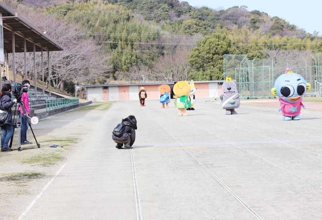 撮影のためスタート位置に着くご当地キャラクターたち(蒲郡市公園グラウンド陸上競技場で)