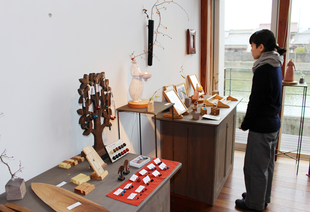 良質の木を使用した作品が並ぶ会場(豊橋・ギャラリー入船で)
