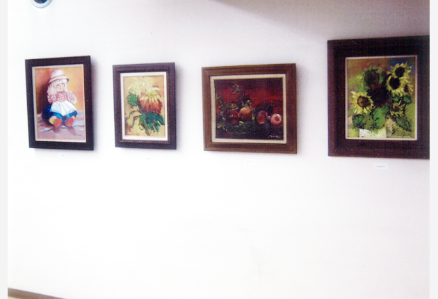杉本とみえさんの油彩画が並ぶロビー(豊橋信用金庫一宮支店提供)