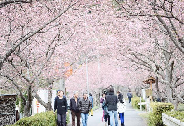 見ごろを迎えた桜のトンネル(新城市長篠河津桜並木で)