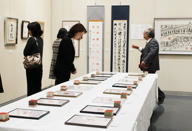 分刻作品や書の軸装作品が並ぶ会場の様子