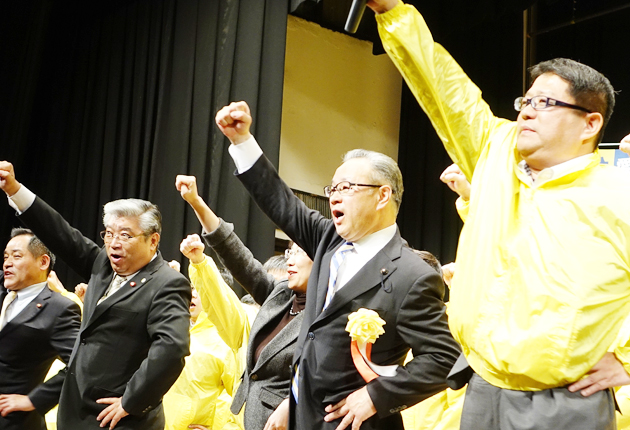 「頑張ろう」を三唱する浅井由崇氏(中央)
