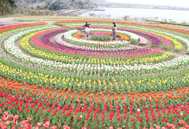 田原市野田町の農業公園・サンテパルクたはらのサンテガーデンの円形花壇で、チューリップが見ごろを迎えた。 直径25メートルの円形花壇には、赤や白、黄色など色鮮やかなチューリップ13種類1万5600本が咲き誇っている。 園内各所にも、プランタ...