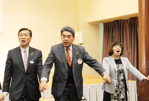 出席者がひとつの輪になり、ライオンズの「また会う日まで」を歌う様子(右から中尾会長、石黒会長、佐野会長)