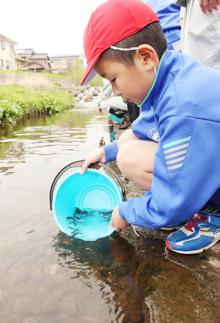 アユの稚魚を放す三谷東小児童