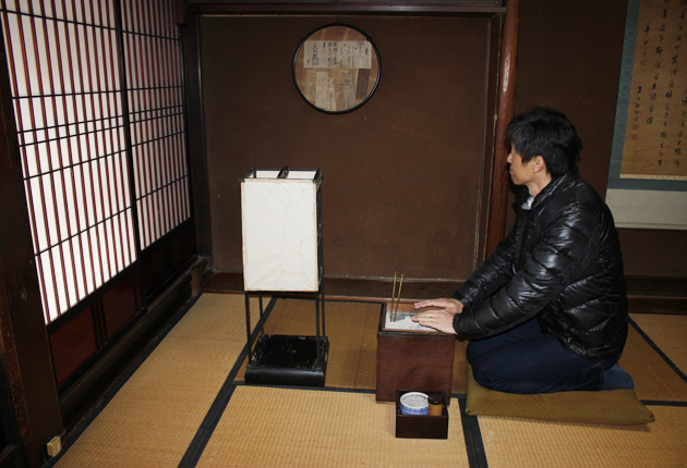 火が入ってほんのりと暖かい角火鉢で暖をとる