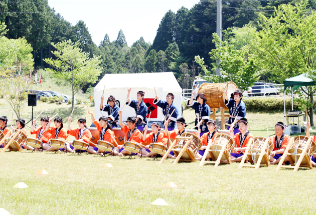 迫力満点の和太鼓演奏を披露する作手中の生徒ら