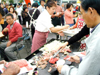 「地元産の牛肉は狂牛病とは無縁で、とてもおいしいですよーっ」。同市の市議会議員の有志たち15人が、豊橋まつり2日目の21日、同市松葉町の旧市民病院跡地で開かれていた豊年農業まつりの会場で、豊橋和牛の肉を使った焼肉昼食会「I LOVE GY...