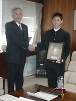 金原市長に区間賞報告などを行った三田選手(蒲郡市役所)
