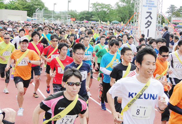 チームでたすきをつないで、42・195キロのコースを走る「豊川リレーマラソン2015」が7日、豊川市陸上競技場で開かれた。過去最多の361チーム、約3000人が出走し、協力してゴールを目指した。 リレーマラソンは、4~10人でチームを組み...