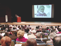 アッバース君の映像を紹介しながら9条を守れと訴えた小野さんの講演