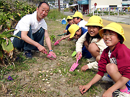 笑顔ではまゆうの種をまく伊良湖小児童たち(左ははまゆうを背にした木村理事長)