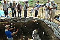 座位屈葬の縄文人骨(中央下部)に見入る一般公開参加者たち