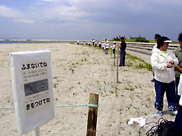 コアジサシの営巣地を守ろうとロープを張る参加者