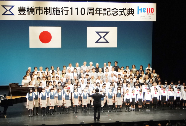 市制施行110周年記念式典で市歌を合唱(8月1日、穂の国とよはし芸術劇場プラット)