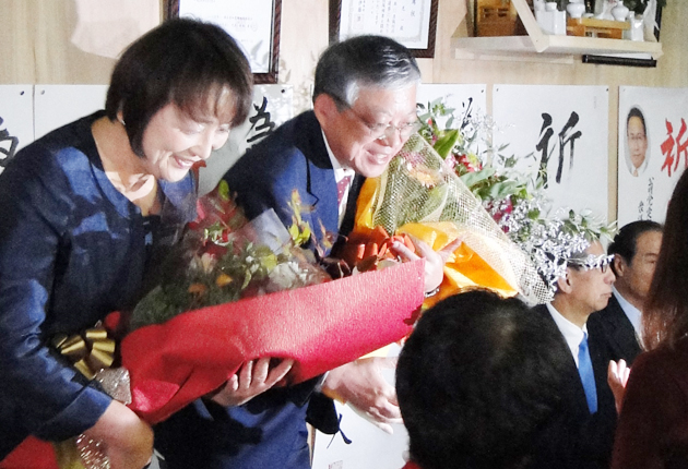 3選を決め、花束を受け取る佐原氏(11月13日、選挙事務所)