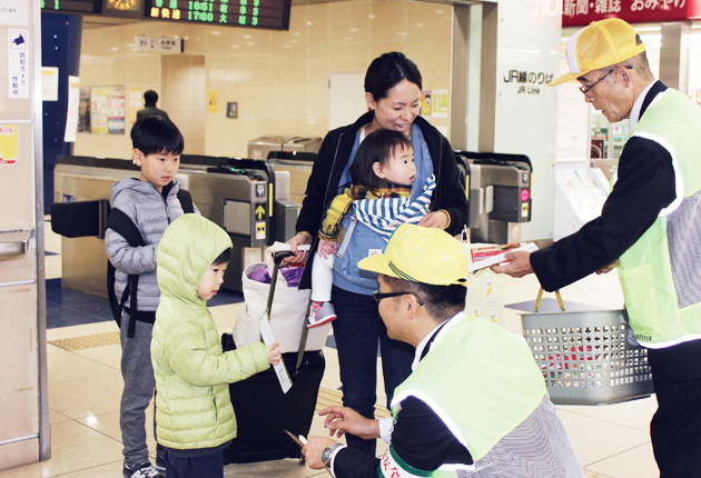 啓発品を受け取る親子連れ(JR蒲郡駅で)