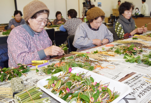 JA愛知東(河合勝正組合長)のつまもの部会の会員10人が28日、新城市長篠の鳳来営農センターで、正月の食卓を彩る「箸置き飾り」の製作を行った。 つまものは料理を引き立てるために用いられる葉っぱや枝花の総称で、同部会では南天、緑もみじ、葉椿...