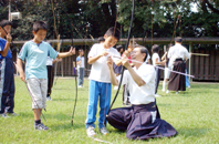 豊橋弓道協会員の指導で弓を引く小学生(豊橋市武道館弓道場で)