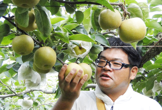 梨を収穫する新田欣也さん(豊橋市石巻西川町で)