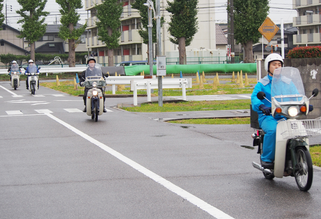 バイク走行する職員ら(ユタカ自動車学校豊橋校で)