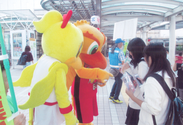 三遠ネオマスコット「ダンカー」と「アリー」/豊橋署がペデストリアンデッキで防犯啓発